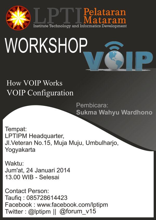 Pelatihan VoIP ini akan dipandu oleh Sukma Wahyu Wardhono. Informasi lebih lanjut hubungi LPTI Pelataran Mataram, http://lptipm.org/ atau poster berikut.